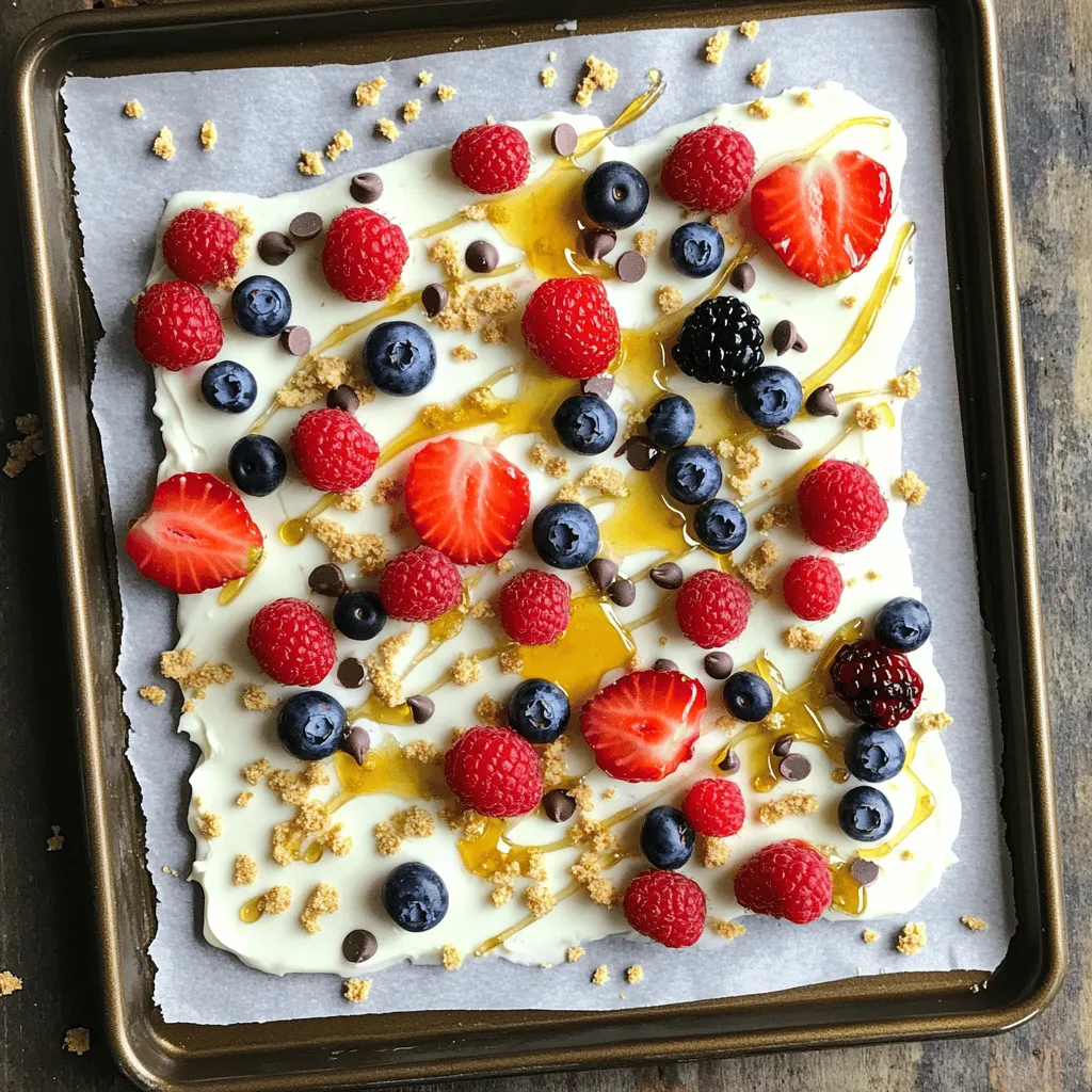 Now, pour the yogurt mixture onto the lined baking sheet. Use a spatula to spread it evenly. Aim for a thickness of about half an inch. After that, take your mixed berries and scatter them over the yogurt layer. Press them down gently so they stick. If you like, sprinkle mini chocolate chips and crushed graham crackers on top for extra flavor and crunch.