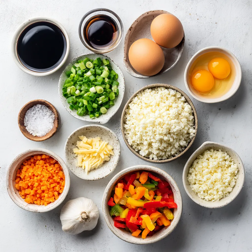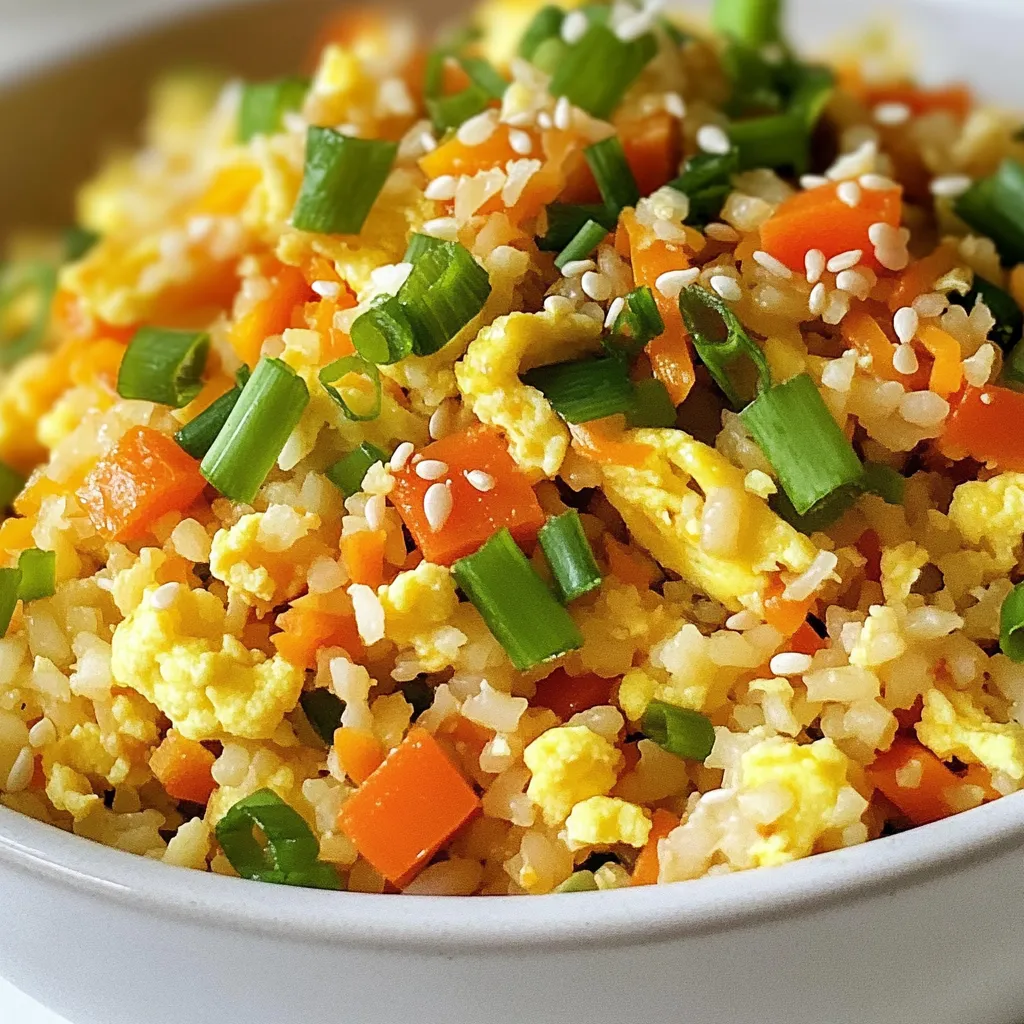 - Cauliflower: Head to Rice Transformation Cauliflower is the star of this dish. It transforms into a rice-like texture with a food processor. This veggie is low in carbs and high in fiber. It makes fried rice lighter and healthier. - Fresh Vegetables: Carrots, Bell Peppers, and Green Onions I love adding fresh veggies. Diced carrots add sweetness and crunch. Bell peppers bring color and flavor. Green onions offer a mild, fresh taste that brightens the dish. - Essential Aromatics: Garlic and Ginger Garlic and ginger create a wonderful aroma. They add depth and warmth to the dish. Minced garlic brings a sharp flavor, while grated ginger adds a slight zing. - Soy Sauce or Tamari: Flavor Base Soy sauce is a key ingredient. It gives the dish a savory, umami flavor. Tamari is a great gluten-free option. Use it to keep the taste strong and satisfying. - Rice Vinegar: Extra Flavor Boost A splash of rice vinegar adds brightness. It balances the savory notes and enhances the overall flavor. This touch makes each bite pop with freshness. - Optional Add-ins: Peas, Corn, or Other Vegetables You can mix in peas or corn for extra sweetness. Feel free to add any favorite veggies. This flexibility makes the dish fun and customizable. - Eggs: Traditional or Substitutes Beaten eggs are classic in fried rice. They add protein and richness. You can swap them with a plant-based egg substitute for a vegan version. - Adding Chicken, Tofu, or Shrimp for Extra Protein Boost the protein by adding cooked chicken, tofu, or shrimp. These options make the dish hearty and filling. Choose what you like best for a personal touch. {{ingredient_image_2}} To start, trim the outer leaves and thick stem of the cauliflower. Cut the head into smaller florets. Use a food processor to pulse these florets. You want them to look like rice grains. This texture makes the dish light and fluffy. Set the cauliflower rice aside for later use. Next, heat a large skillet or wok over medium-high heat. Pour in the sesame oil. Allow it to warm until it shimmers gently. Add the finely chopped green onions, diced carrot, and bell pepper. Stir-fry these veggies for about 3-4 minutes. You want them to soften and show bright colors. Now, it's time to add aromatics. Introduce the minced garlic and grated ginger into the mix. Sauté them for another minute. This step fills your kitchen with a delicious aroma. Push the vegetable mixture to one side of the skillet. Create a clear area for the eggs. Pour the beaten eggs into this space and scramble them gently. Cook until they are firm and no longer runny. Then, combine them with the veggies. Next, incorporate the cauliflower rice into the skillet. Mix all the ingredients gently. Make sure every grain of cauliflower gets coated with flavor. Now, drizzle soy sauce and rice vinegar over the mixture. Stir everything well to combine. Season with salt and pepper to your taste. Let it cook for about 5-6 minutes. Stir occasionally, ensuring the cauliflower rice gets tender but still has a slight bite. If you want more veggies, fold in peas or corn. Cook for an additional 2 minutes to heat them through. Enjoy your delicious cauliflower fried rice! How to Prevent Soggy Fried Rice To keep your cauliflower fried rice from getting soggy, use dry cauliflower. After processing, let it sit for a few minutes. This helps remove excess moisture. Also, cook over high heat. This method ensures that everything cooks quickly, so the rice stays firm. Choosing the Right Cauliflower Freshness Fresh cauliflower makes a big difference. Look for heads that are firm and have bright green leaves. Avoid any that show signs of browning or wilting. A fresh head of cauliflower will give you the best texture. Experimenting with Seasonings Don’t be afraid to play with spices! Adding a pinch of chili flakes can give your dish some heat. You can also try adding cumin or smoked paprika for a different twist. These flavors make each bite exciting. Adding Fresh Herbs for Extra Flavor Fresh herbs like cilantro or basil can brighten the dish. Chop them finely and sprinkle them on top just before serving. This small step adds a burst of freshness that elevates the meal. Best Skillet or Wok to Use A large skillet or wok works best for frying the rice. It should have a flat bottom to ensure even heat. Non-stick surfaces help prevent sticking, making it easier to stir and toss the ingredients. Recommended Food Processor for Ricing Cauliflower When ricing cauliflower, a good food processor makes it fast. Look for a model with a strong motor. It should easily chop the florets into small bits. This ensures uniform size for even cooking. Pro Tips Use Fresh Cauliflower: Always choose a firm and fresh head of cauliflower for the best texture and flavor in your fried rice. Don't Overcook the Cauliflower: Keep a close eye on the cauliflower rice while cooking; it should be tender yet retain a slight crunch for the best eating experience. Experiment with Vegetables: Feel free to add your favorite vegetables, such as snap peas or broccoli, to customize the dish and add more nutrition. Perfect the Seasoning: Taste as you go! Adjust the soy sauce and seasoning to your preference to balance the flavors perfectly. {{image_4}} Substituting Eggs with Plant-Based Alternatives If you want a vegan dish, you can skip the eggs. Use a mix of chickpea flour and water instead. This mix will help bind your fried rice and add protein. It also gives a nice texture. Adding Tofu for a Protein Boost Tofu is a great choice for extra protein. Cube firm tofu and sauté it in the skillet before adding the cauliflower rice. This adds a lovely texture and flavor to your dish. Seasonal Veggies for Flavor Variation Add seasonal vegetables for new tastes. Think about using zucchini in summer or root veggies in winter. Each season brings fresh flavors that can elevate your dish. Creative Add-ins: Mushrooms, Broccoli, and More Mushrooms and broccoli are fantastic choices. They add eart