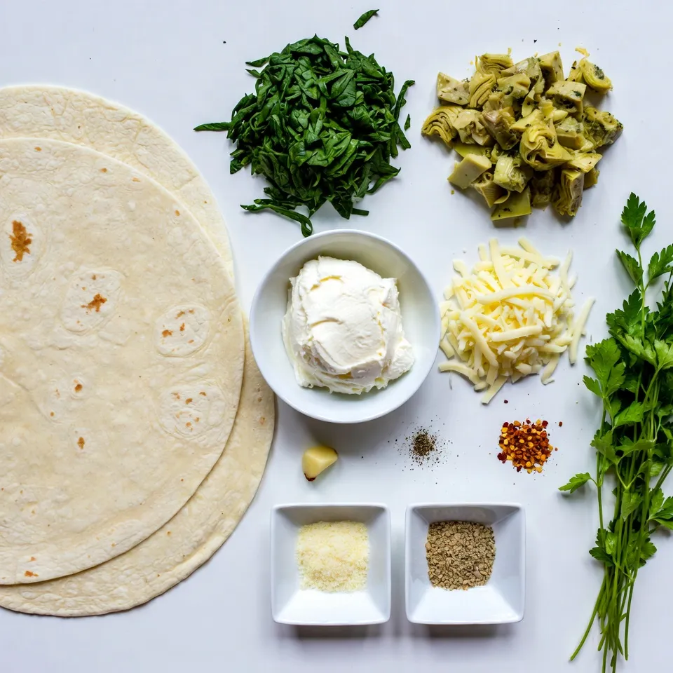 To make Cheesy Spinach Artichoke Pinwheels, gather these items: