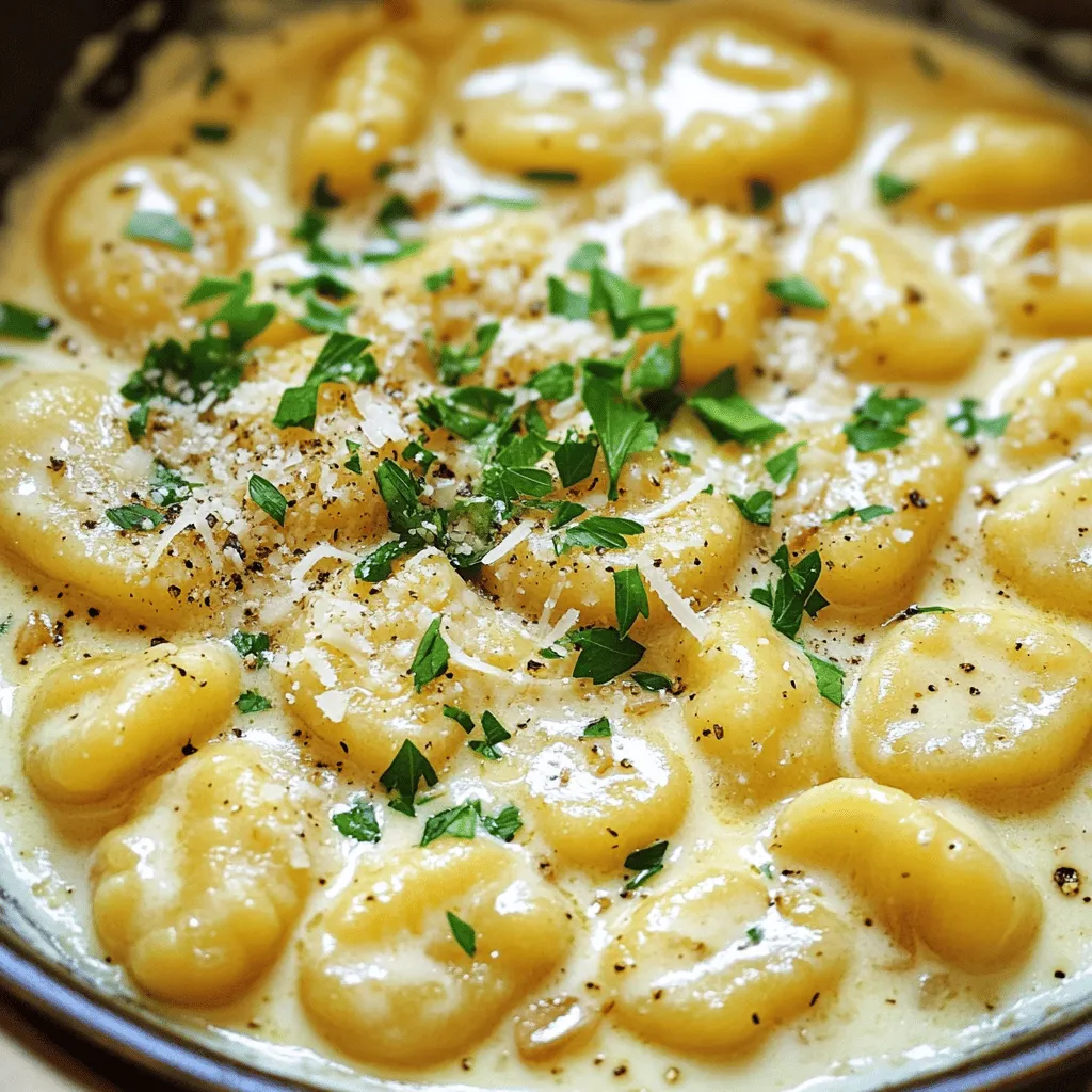 For a beautiful presentation, serve the gnocchi in shallow bowls. Drizzle extra creamy sauce on top. Add a sprinkle of Parmesan and some fresh parsley. This not only looks nice but also adds a fresh taste. Share with friends or enjoy it all yourself!