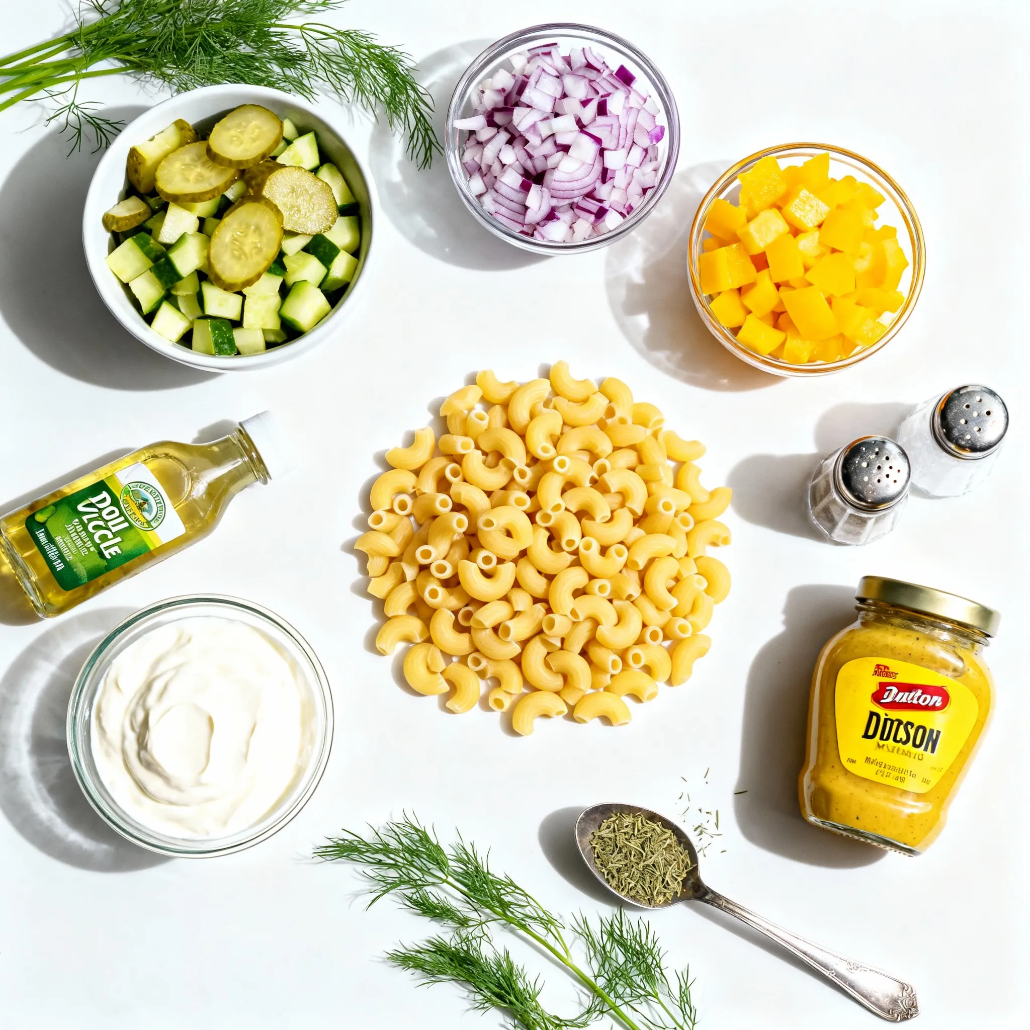 - 8 oz elbow macaroni or rotini pasta - 1 cup diced dill pickles - ½ cup finely diced red onion - ½ cup diced bell pepper The stars of this salad are the pasta and pickles. You can use either elbow macaroni or rotini pasta. Both work well with the creamy dressing. The diced dill pickles add a tangy crunch that makes this dish special. You should also add finely diced red onion and bell pepper for a nice flavor contrast. The red onion gives a bit of sharpness, while the bell pepper adds sweetness. - ¼ cup mayonnaise or Greek yogurt - 2 tablespoons dill pickle juice - 1 teaspoon Dijon mustard - 1 teaspoon dried dill For the dressing, you can choose between mayonnaise or Greek yogurt. Greek yogurt gives a lighter feel, while mayonnaise adds creaminess. Then, add dill pickle juice for extra tang. Dijon mustard adds a touch of spice, and dried dill enhances the pickle flavor. Mix these together for a creamy dressing that coats the pasta well. - Salt and black pepper to taste - Fresh dill sprigs for garnish Don’t forget to season your dish! Add salt and black pepper to taste. This step is key to bringing out all the flavors. Finally, use fresh dill sprigs as a garnish. They not only look great but also add a fresh aroma that makes the salad even better. {{ingredient_image_2}} First, bring a large pot of salted water to a boil. Add 8 oz of elbow macaroni or rotini. Cook until the pasta is al dente, or firm to the bite. This usually takes about 8-10 minutes. Once done, drain the pasta in a colander. Rinse it under cold water. This helps stop the cooking and cools the pasta quickly. While your pasta cooks, chop the veggies. Take 1 cup of dill pickles, ½ cup of finely diced red onion, and ½ cup of diced bell pepper. You can use green or yellow bell pepper for a sweet touch. Make sure all pieces are small and even. This helps the flavors mix well. In a medium bowl, mix the dressing. Combine ¼ cup of mayonnaise or Greek yogurt, 2 tablespoons of dill pickle juice, and 1 teaspoon of Dijon mustard. Add 1 teaspoon of dried dill. Season with salt and black pepper to taste. Stir until creamy and well mixed. In a large bowl, add the cooled pasta. Then, add the diced dill pickles, red onion, and bell pepper. Pour the dressing over the pasta and veggies. This is where the magic happens! Use a spatula or large spoon to gently toss everything together. Make sure every piece is coated in dressing. Cover the bowl with plastic wrap or a lid. Refrigerate for at least 30 minutes to let the flavors meld. Before serving, stir the salad well. Taste it to see if you need more salt, pepper, or pickle juice. For a lovely touch, garnish with fresh dill sprigs and some reserved pickle slices. Enjoy this bright and tangy pasta salad! Adjust the seasoning and dressing to your taste. Start with the basics. Add salt and pepper as you mix. If you want more zing, add more dill pickle juice. You can also tweak the dressing by adding a bit more mustard or dill. This helps to bring out all the flavors. Taste as you go to find your perfect mix. This pasta salad is best served chilled. It tastes great on a hot day. Use colorful dishes to make it pop. A bright bowl can make your meal more fun. You can serve it as a side dish or the main course. Either way, it’s sure to please. Make your salad look extra special. Use fresh garnishes like dill sprigs. Place them on top just before serving. You can also add a few pickle slices for a nice touch. This adds color and makes it look inviting. A well-presented dish makes the meal even better! Pro Tips Perfect Pasta Texture: Make sure to cook the pasta just until al dente. This will ensure that the pasta retains a slight bite and doesn't become mushy when mixed with the dressing and vegetables. Customize Your Veggies: Feel free to mix in other vegetables like cucumbers or cherry tomatoes for added color and texture. Just make sure they are finely chopped to match the size of the pasta. Flavor Boost: For an extra kick, consider adding a pinch of cayenne pepper or a splash of hot sauce to the dressing. This will add a subtle heat that complements the tanginess of the pickles. Make-Ahead Magic: This pasta salad is perfect for meal prep! You can make it a day in advance, and the flavors will only get better as it sits in the fridge. {{image_4}} You can make this salad lighter. Substitute Greek yogurt for mayonnaise. Greek yogurt still adds creaminess. It also boosts protein and cuts fat. This swap keeps the same great taste. You get a fresher feel with every bite. Want to make it heartier? Consider adding cooked chicken or chickpeas. Cooked chicken gives a nice protein boost. Chickpeas add a plant-based option. Both options mix well with the pasta. They make the salad fill you up more. Feel free to experiment with different veggies. Try adding crunchy celery or sweet carrots. Both add texture and flavor. You can even toss in peas or corn. Each veggie brings its own unique taste. This keeps the salad fun and fresh. Store leftover Dill Pickle Pasta Salad in an airtight container. This keeps it fresh and tasty. Make sure to cool the salad to room temperature before sealing. It will last well in the fridge for about 3 to 5 days. If you notice any changes in color or smell, it’s best to throw it away. For the best taste, enjoy your pasta salad within 3 days. After that, it may lose its crunch and flavor. The pickles can get too soft, and the dressing may separate. If you plan to keep it longer, consider other storage options. You can freeze pasta salad, but I don't recommend it. Freezing can change the texture of the pasta and veggies. If you want to try, place the salad in a freezer-safe container. Leave some room for expansion. To thaw, move it to the fridge overnight before serving. Enjoy it fresh for the best flavor! To make this salad vegetarian, you don't need to change much. The main ingredients are already plant-based. Just ensure any mayo you use is vegetarian-friendly. You can swap