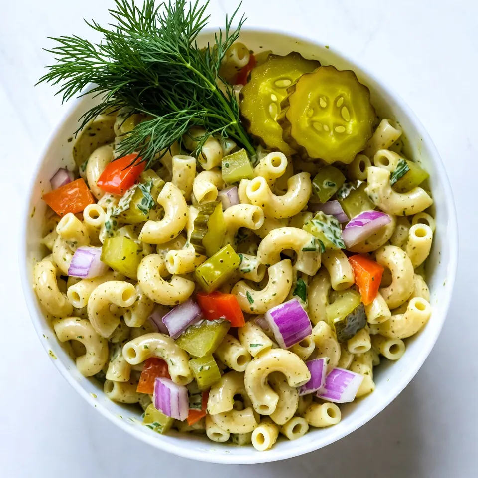A refreshing pasta salad featuring dill pickles, vegetables, and a creamy dressing.