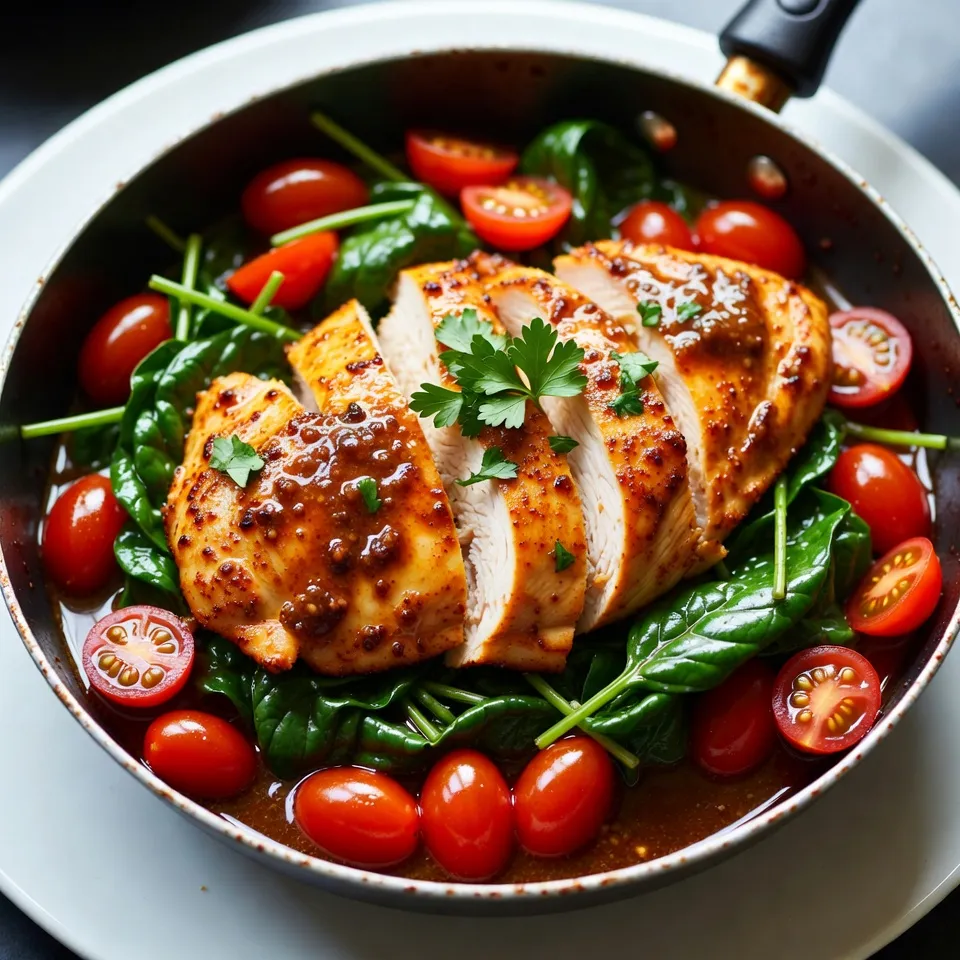 Once the chicken is done, take it out of the skillet. Pour the honey mustard sauce into the same skillet. Stir for 1-2 minutes to thicken it up. Now, add fresh baby spinach and halved cherry tomatoes. Stir until the spinach wilts, which takes about 2-3 minutes.