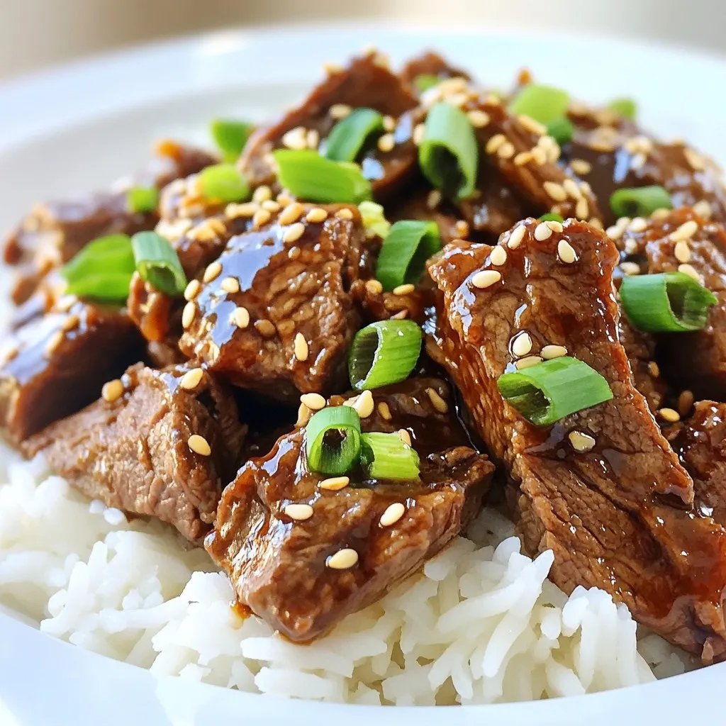 Drizzle some of the sauce over the beef to add shine. Top it off with sliced green onions and sesame seeds for a nice crunch. This simple touch makes your dish look beautiful and inviting. Enjoy your meal!