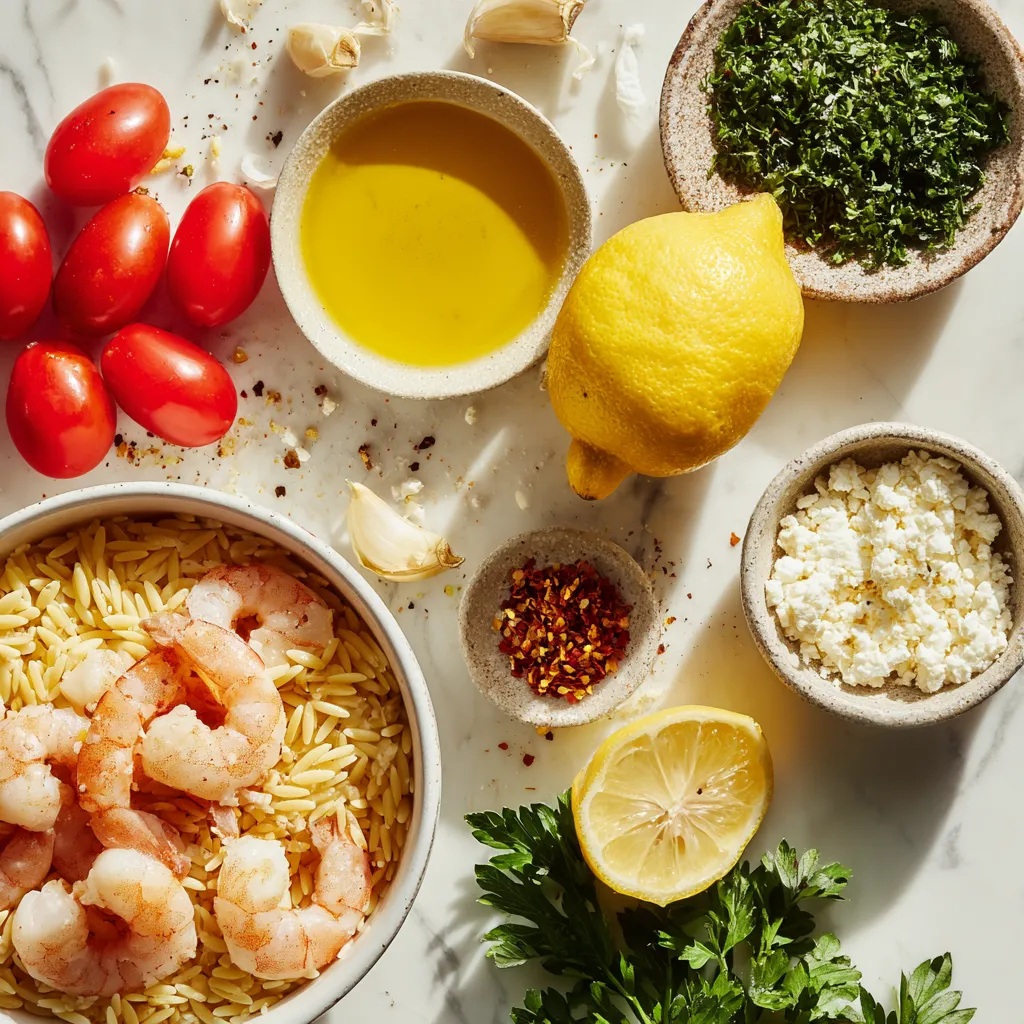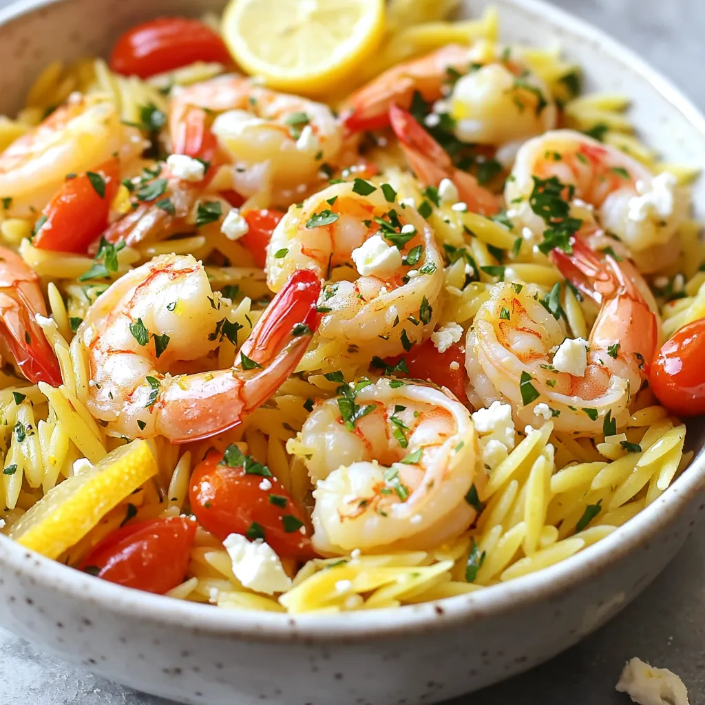 A vibrant and flavorful dish featuring succulent shrimp, orzo pasta, and a zesty lemon garlic sauce.
