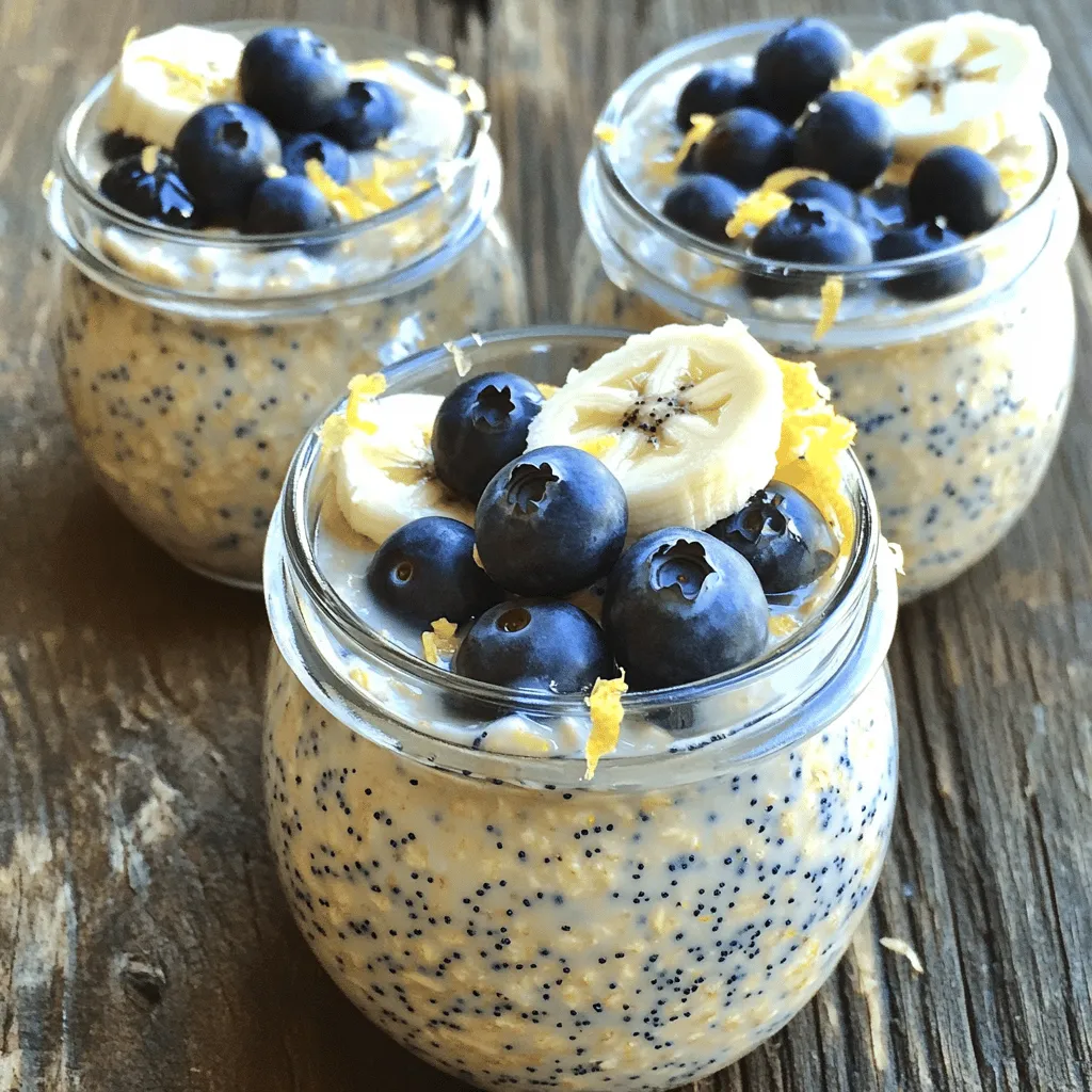- 1 cup rolled oats - 2 cups almond milk (or your preferred milk variety) - 2 tablespoons chia seeds - Zest from 1 medium lemon - 2 tablespoons freshly squeezed lemon juice - 2 tablespoons maple syrup (adjust according to your sweetness preference) - 2 tablespoons poppy seeds - 1 teaspoon pure vanilla extract - Fresh fruits for topping (such as juicy blueberries or ripe sliced bananas) - A pinch of salt These ingredients come together to create a bright and refreshing dish. First, rolled oats form the base. They soak up the milk and get soft. Next, almond milk adds a creamy touch. You can use any milk you like, though. Chia seeds are small but mighty. They help thicken the oats and pack in nutrients. The zest and juice of one lemon give a bright flavor. It wakes up your taste buds! Maple syrup adds a gentle sweetness. You can adjust this to fit your taste. Poppy seeds sprinkle in a bit of crunch and fun. Vanilla extract adds a warm background note. To finish, fresh fruits are a must! Blueberries or bananas add color and taste. The pinch of salt balances all the flavors. These ingredients make a tasty, healthy breakfast you can prep the night before. 1. Mixing the ingredients Start by taking a mixing bowl. Add 1 cup of rolled oats, 2 cups of almond milk, and 2 tablespoons of chia seeds. Then, add the zest from 1 lemon, 2 tablespoons of lemon juice, 2 tablespoons of maple syrup, and 2 tablespoons of poppy seeds. Lastly, add 1 teaspoon of vanilla extract and a pinch of salt. Use a whisk or spoon to mix everything well. 2. Portioning into jars or containers After mixing, it’s time to portion the oats. Use two to four jars or airtight containers. Make sure to divide the mixture evenly among them. This helps you grab one in the morning with ease. 3. Refrigeration process Once you have filled the jars, seal them tightly. Place them in the refrigerator. Let the oats chill overnight, or for at least 4 hours. This step is key for the oats to soften and soak in all the flavors. 1. Topping with fresh fruits When you’re ready to eat, stir the oats well. You can top them with fresh fruits. I love juicy blueberries or ripe sliced bananas. They add color and extra taste. 2. Presentation tips for aesthetics For a beautiful touch, drizzle a bit of maple syrup on top. You can also sprinkle some extra poppy seeds. This makes your breakfast look inviting and delicious. 1. How to taste and modify sweetness After stirring the mixture, take a small taste. If you want it sweeter, you can add more maple syrup. Start with half a tablespoon at a time. Mix it in and taste again until it’s just right for you. For the best creaminess, soak your oats for at least 4 hours or overnight. The longer they sit, the softer they become. This soaking lets the oats absorb the almond milk and flavors. If you prefer a thicker texture, try adding a bit more chia seeds. They help the oats thicken and add a nice crunch. To boost flavor, consider adding spices like cinnamon or nutmeg. A dash of ginger can add a nice kick. You might also try a splash of almond extract for a nutty taste. These small changes can make your oats even more delightful. Want to save time during your busy week? Make a larger batch! You can double the recipe and store jars for up to 5 days. This way, you have a quick breakfast ready each morning. Just grab a jar, stir, and enjoy! {{image_4}} You can make this breakfast fit your needs. For a dairy-free option, try almond milk or oat milk. Both work well and taste great. If you want to change up the sweetness, use honey or agave syrup instead of maple syrup. Each sweetener adds its own flavor. You can get creative with flavors in your overnight oats. Adding fresh berries like strawberries or raspberries gives a nice pop of color and taste. Nuts like almonds or walnuts add crunch. You can also try other citrus fruits. Lime or orange zest can make your oats even zestier. Use seasonal fruits to change things up. In summer, add peaches or cherries. In fall, try apples or pears. This keeps your breakfast fresh and fun. Each season has its own fruits that can make your oats taste amazing. Store your lemon poppy seed overnight oats in the fridge. They stay fresh for up to 5 days. Use airtight containers to keep them from drying out. Glass jars work great and let you see the layers. Plastic containers are also fine, but make sure they seal well. You can freeze your overnight oats if you want to save some for later. Portion them into freezer-safe jars or containers. Leave a little space at the top for expansion. They can last up to 2 months in the freezer. Just make sure to label each jar with the date. To enjoy frozen overnight oats, take them out of the freezer. Move them to the fridge for about 8 hours to thaw. If you're in a hurry, you can set them out on the counter for about 1 hour. Once thawed, stir well and add fresh toppings like fruits or nuts. Enjoy your delicious breakfast! Yes, you can make lemon poppy seed overnight oats vegan. Just use almond milk or another plant-based milk. The other ingredients are already vegan-friendly. This way, you keep the zest and flavor without any dairy. Overnight oats should sit for at least four hours. This allows the oats to soak and become soft. However, leaving them overnight gives the best texture and flavor. Healthy toppings for overnight oats include: - Fresh fruits (like berries or bananas) - Nuts (like almonds or walnuts) - Seeds (like chia or hemp seeds) - A drizzle of honey or maple syrup These toppings add flavor and nutrition to your oats. You can use quick oats, but the texture will change. Quick oats soak up liquid faster. This makes them softer and less chewy. If you prefer a creamier texture, quick oats will work just fine. In this post, we explored how to make delicious lemon poppy seed overnight oats. You learned about each ingredient, from rolled oats to fresh fruits. We walked through the steps for mixing, refrigerating, and serving. Plus, I shared tip