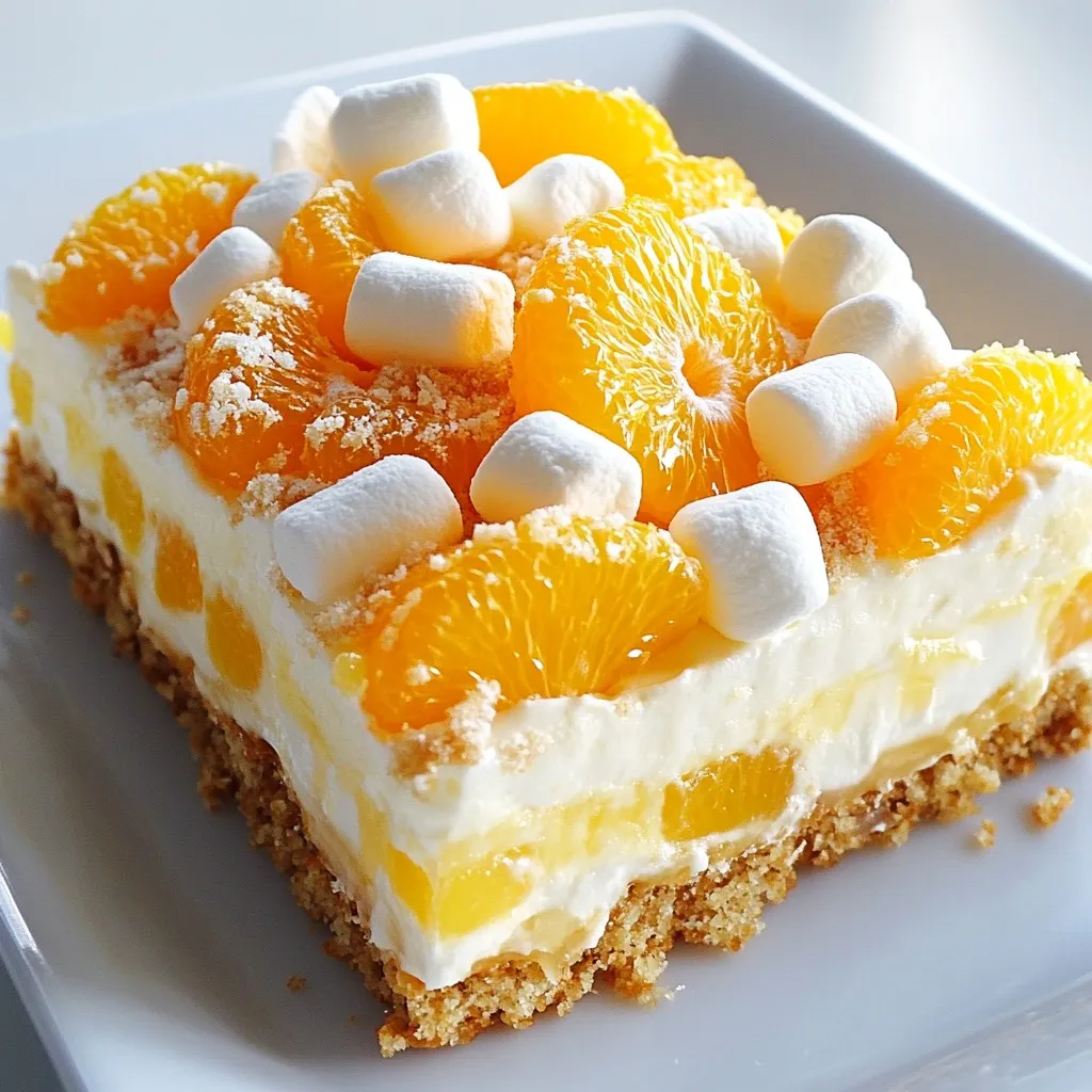 - Prepare the Fruit Layer: In another bowl, combine the drained mandarin oranges, crushed pineapple, and mini marshmallows. Gently mix the fruits together, then spoon this delightful fruity mixture evenly over the cream cheese layer.
