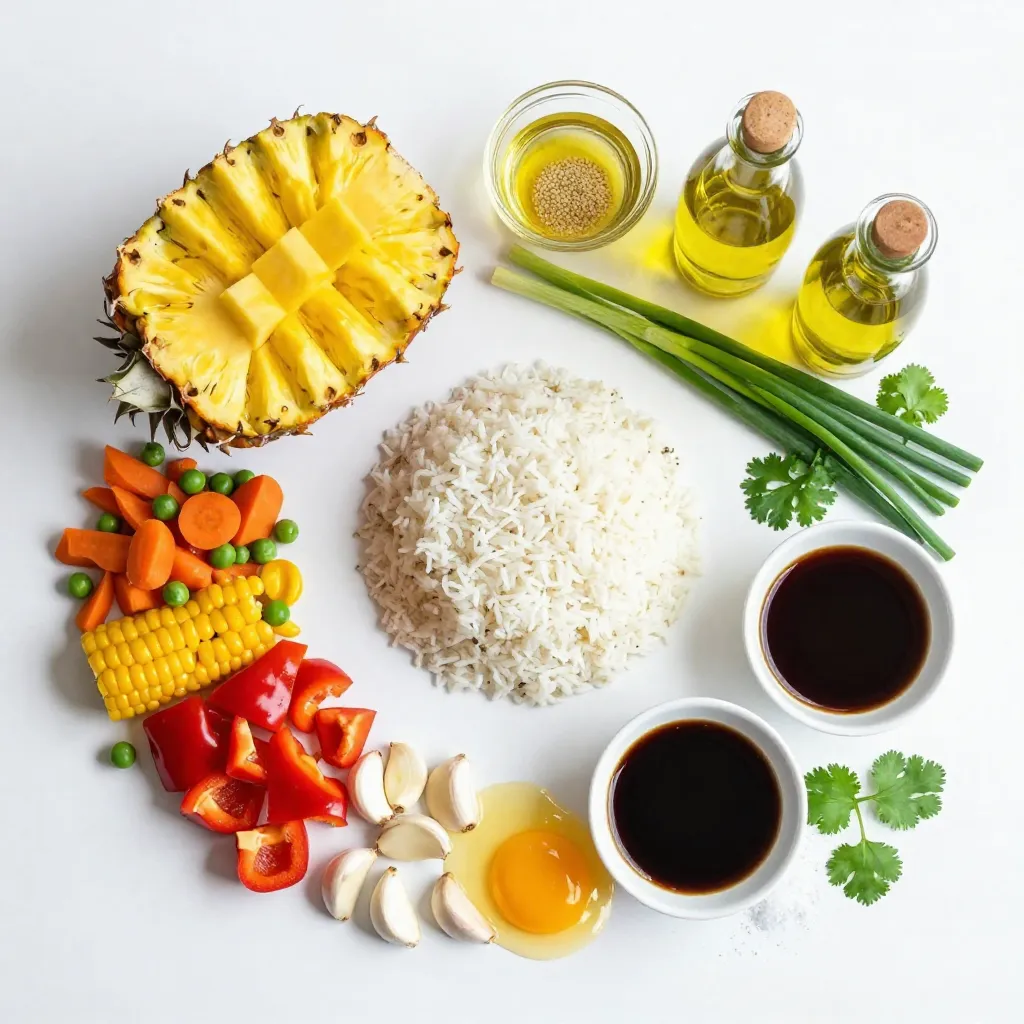 Using day-old jasmine rice works best here. It gives the dish a great texture. Choose a ripe pineapple for a sweet taste. The mixed vegetables add color and nutrients. Red bell pepper adds a nice crunch. Green onions bring a fresh flavor. Garlic gives a lovely aroma. Soy sauce and sesame oil add depth to the dish. Olive oil is perfect for cooking. The eggs help bind everything together. Lastly, cilantro adds freshness as a garnish.