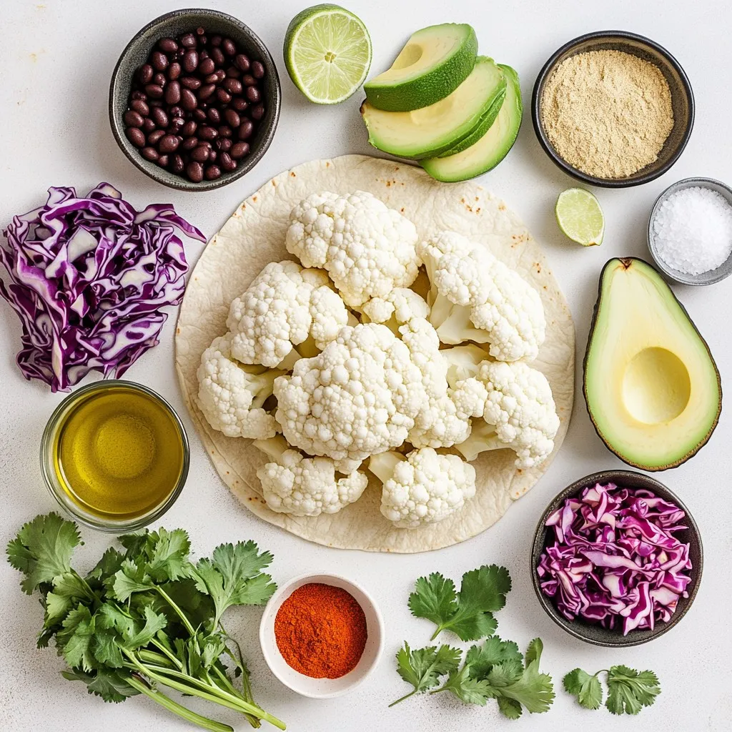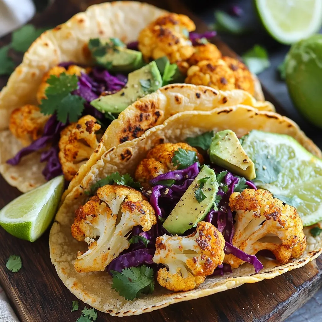 - 1 medium cauliflower, cut into bite-sized florets - 2 tablespoons extra-virgin olive oil - 1 teaspoon smoked paprika - 1 teaspoon ground cumin - 1 teaspoon garlic powder - Sea salt and freshly cracked black pepper, to taste - 8 small corn tortillas - 1 cup canned black beans, drained and rinsed - 1 ripe avocado, sliced - 1 cup red cabbage, finely shredded - 1/4 cup fresh cilantro, chopped - Lime wedges, for serving Roasted cauliflower tacos are simple and tasty. You need fresh cauliflower florets as the star. They give a nice texture and flavor. The olive oil adds richness, making them crisp. Smoked paprika provides a warm, smoky taste. Ground cumin and garlic powder add depth to the dish. For toppings, I love using black beans. They add protein and make the meal filling. Avocado slices bring creaminess, while red cabbage adds a crunchy bite. Fresh cilantro brightens the tacos and adds color. Lime wedges are great for squeezing on top. This mix of ingredients makes tasty tacos everyone will enjoy. {{ingredient_image_2}} Preheating the oven: Start by preheating your oven to 450°F (230°C). This high heat helps the cauliflower roast well. Mixing seasonings: In a big bowl, mix together two tablespoons of olive oil, one teaspoon of smoked paprika, one teaspoon of ground cumin, and one teaspoon of garlic powder. Add a pinch of sea salt and fresh black pepper. Coating the cauliflower: Take one medium cauliflower, cut it into bite-sized florets, and toss them in the bowl. Use your hands or a spatula to coat all the florets with the seasoning mix. Each piece should be well covered. Spreading on a baking sheet: Spread the seasoned cauliflower in a single layer on a baking sheet. Make sure the pieces are not crowded so they can roast evenly. Cooking time and flipping tips: Roast the cauliflower for 25 to 30 minutes. Flip them halfway through cooking to brown them on all sides. When they are golden and tender, they are ready to come out. Warming the tortillas: While the cauliflower roasts, heat eight small corn tortillas. Place them in a dry skillet over medium heat. Heat each side for about one minute until they are soft. Wrap them in a towel to keep warm. Building the taco layers: Once the cauliflower is roasted, it’s time to assemble the tacos. On each warm tortilla, add a scoop of roasted cauliflower. Top it with black beans, slices of avocado, and some shredded red cabbage for crunch. Final touch: Sprinkle chopped cilantro on top and serve your tacos with lime wedges for a fresh squeeze of flavor. To make the best roasted cauliflower, set your oven to 450°F (230°C). This high heat helps the cauliflower brown well. Roast the florets for 25-30 minutes. Flip them halfway through cooking for even browning. The perfect texture is golden and tender when you pierce it with a fork. Choose small corn tortillas for this dish. They add a nice flavor and texture. Warm them in a dry skillet over medium heat for about 1 minute on each side. This makes them soft and easy to fold. You can also heat them in the oven, wrapped in foil, if you prefer. Spice things up with smoked paprika, garlic powder, or ground cumin. These spices will make your tacos burst with flavor. For toppings, try fresh cilantro, sliced avocado, or crunchy red cabbage. A squeeze of lime adds a bright touch. Pair your tacos with salsa for extra zest and enjoyment. Pro Tips Choose the Right Cauliflower: Select a medium-sized cauliflower with tightly packed florets and vibrant green leaves for the best flavor and texture. Experiment with Spices: Feel free to mix in other spices like chili powder or turmeric for an added flavor kick and health benefits. Keep Tortillas Warm: After warming the tortillas, keep them wrapped in a towel to maintain their softness until serving. Customize Your Toppings: Use your favorite toppings such as pickled onions or a dollop of sour cream to personalize your tacos! {{image_4}} You can easily make these tacos heartier. One way is by adding more beans. Black beans provide a great protein boost. Simply mix them in with the roasted cauliflower. You can also add pinto beans for extra flavor. Another option is to use plant-based meats. Look for items like soy chorizo or lentil patties. These can add a nice texture and taste. Just cook them according to the package instructions, and mix them with your cauliflower. Toppings can really make your tacos shine. Try alternative veggie toppings for more crunch. Radishes or sliced jalapeños can add a fresh kick. You might also enjoy some diced tomatoes or corn for sweetness. For added flavor, consider sauces or dressings. A zesty lime crema or spicy chipotle sauce works wonders. Just drizzle a bit on top before serving. This will elevate your tacos and make them even more enjoyable. Tortillas are the base of your tacos. You can switch things up with whole wheat or flour tortillas. Whole wheat adds a nutty flavor and extra fiber. Flour tortillas are soft and easy to fold. If you need gluten-free options, corn tortillas are a perfect choice. They are tasty and easy to find. Just warm them up in a dry skillet and fill them with your delicious toppings. Enjoy the flexibility of making these tacos your own! To store leftover roasted cauliflower, let it cool first. Place it in an airtight container. Keep it in the fridge for up to three days. This will help keep the flavor fresh. For the tortillas, wrap them in foil or plastic. This keeps them soft and prevents them from drying out. To reheat tacos, use a skillet over medium heat. This warms them nicely without making them soggy. You can also microwave them for about 30 seconds. Just be careful not to overheat, or they will lose their crunch. If you want to keep the texture, try reheating the cauliflower in the oven. This helps it stay crispy. You can freeze roasted cauliflower for later use. Place cooled florets in a freezer bag. Squeeze out all the air before sealing it. It will last for up to three months. To thaw, put 