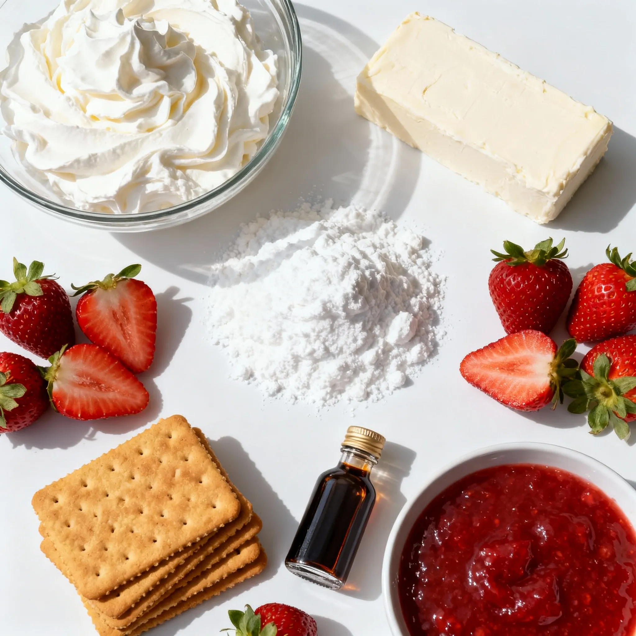 These main ingredients create the creamy filling and light whipped topping. Heavy cream gives richness, while cream cheese adds a tangy flavor. The powdered sugar sweetens the mix, and vanilla brings warmth to the taste.