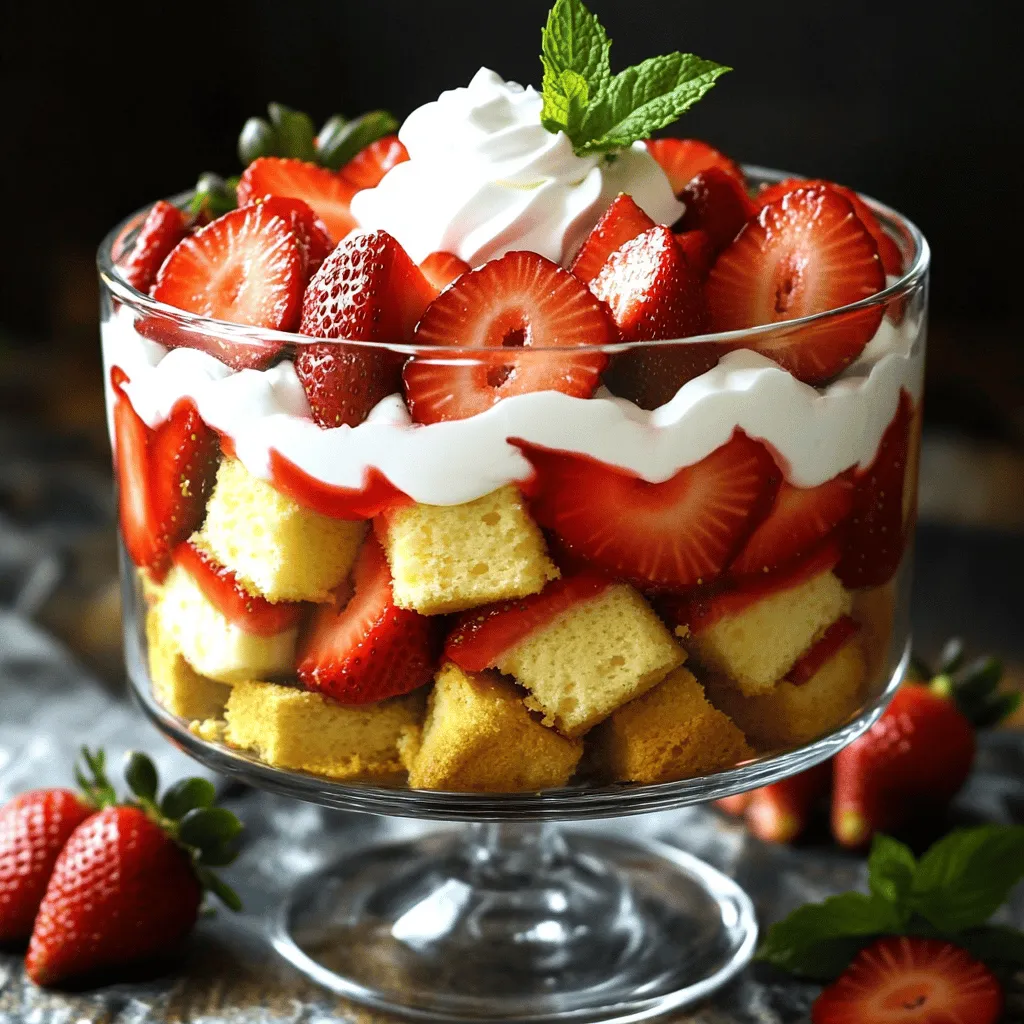 To make your trifle shine, let your strawberries macerate. Mix the sliced strawberries with sugar and let them sit for 30 minutes. This step brings out their sweet juices. You can also play with the order of your layers. Try starting with cake, then yogurt, and finish with cream. This can add fun visuals.