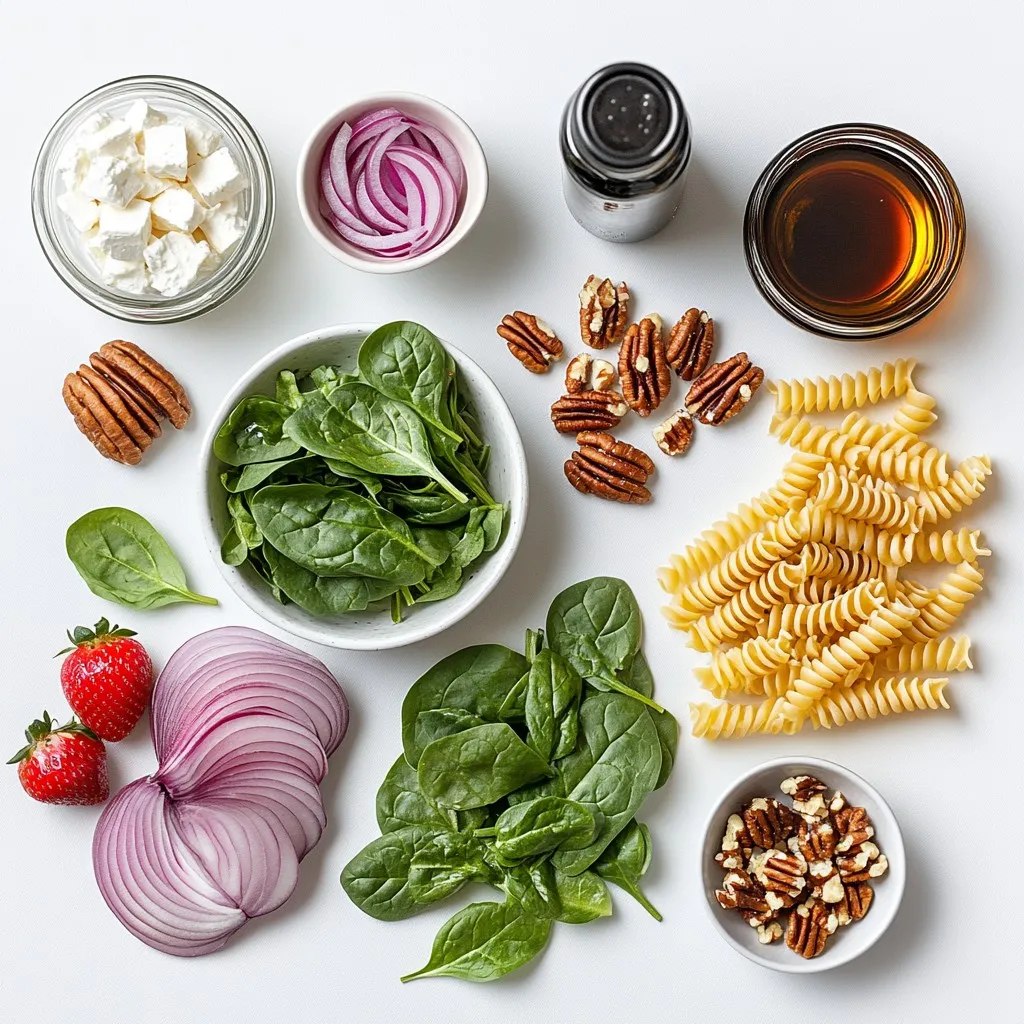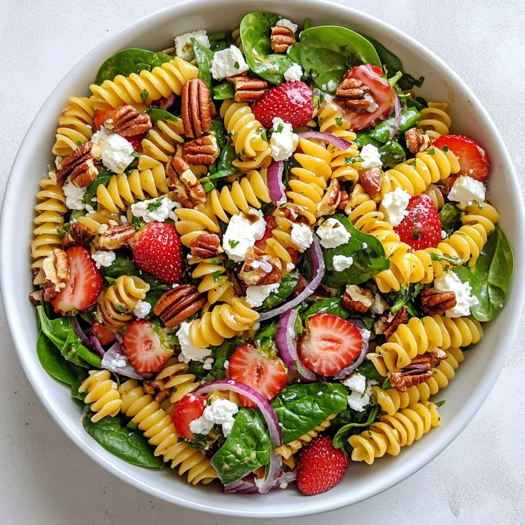 - 8 oz. fusilli pasta - 4 cups fresh spinach - 1 cup ripe strawberries - 1/2 cup feta cheese - 1/4 cup red onion - 1/4 cup pecans - 3 tablespoons extra virgin olive oil - 2 tablespoons balsamic vinegar - 1 tablespoon honey - Salt and freshly ground black pepper Gather these ingredients before you start cooking. Each one adds flavor and texture to the salad. The fusilli pasta gives a nice twist, and the fresh spinach adds a vibrant green color. Ripe strawberries bring sweetness, while feta cheese adds a creamy element. The red onion gives a slight bite, and pecans add crunch. Using extra virgin olive oil and balsamic vinegar creates a perfect dressing. Honey balances the flavors, making each bite a delight. Make sure to wash the spinach well. Slice the strawberries just before mixing for freshness. You can toast the pecans for extra flavor, but it’s not necessary. The key is to have everything ready to mix for a quick and easy salad. {{ingredient_image_2}} To start, boil a pot of water. Add a pinch of salt to the water. Then, add 8 oz. of fusilli pasta. Cook it according to the package instructions until al dente. This usually takes about 8-10 minutes. After cooking, drain the pasta in a colander. Rinse it under cold running water. This cools the pasta and stops the cooking process. In a large mixing bowl, add the cooled pasta. Then, toss in 4 cups of chopped spinach. Next, add 1 cup of sliced strawberries. Crumble in 1/2 cup of feta cheese. Add 1/4 cup of finely sliced red onion. Finally, add 1/4 cup of toasted pecans. Gently fold these ingredients together. Be careful not to mash the strawberries. In a small bowl, whisk together 3 tablespoons of extra virgin olive oil. Next, add 2 tablespoons of balsamic vinegar. Then, mix in 1 tablespoon of honey. Add a pinch of salt and freshly ground black pepper. Whisk until the mixture is smooth and well combined. Drizzle the prepared dressing over the salad. Use a large spoon to gently toss the salad. Make sure all the ingredients are coated in the dressing. After mixing, taste the salad. Adjust the seasoning if needed. You can add more salt, pepper, or honey to fit your taste. Let the salad sit for about 10 minutes before serving. This short break helps the flavors blend well. The resting time enhances the taste, making each bite more enjoyable. To enhance the flavor of your salad, focus on seasoning. You can add more salt or pepper as needed. If you want a sweeter taste, mix in more honey. For a tangier kick, try adding a bit more balsamic vinegar. Each adjustment can make a big difference. Taste your salad after each change. This helps you find the perfect balance of flavors. For an appealing serve, use a large, shallow bowl. This lets the colors pop. Garnish the top with extra strawberry slices and crumbled feta. This adds a burst of color and texture. You can also place whole strawberries around the bowl. This creates a fun and artistic look. A sprig of mint on top can add a fresh touch. You can prep parts of this salad ahead of time. Cook the pasta and store it in the fridge. Wash and chop the spinach and store it separately. Slice the strawberries just before serving to keep them fresh. Mix the dressing in advance and keep it in a jar. This way, you can enjoy a quick assembly when you're ready to eat. Pro Tips Use Fresh Ingredients: Always opt for fresh spinach and ripe strawberries to enhance the flavor and nutrition of your salad. Customize Your Nuts: Feel free to substitute pecans with walnuts or almonds for a different flavor and texture. Make Ahead: This salad can be prepared a few hours in advance; just add the dressing right before serving to keep it fresh. Elevate with Herbs: Adding fresh herbs like basil or mint can bring a delightful twist to the salad's flavor profile. {{image_4}} You can easily change some ingredients in this salad. If you don’t have strawberries, try using blueberries or raspberries. These berries add a sweet and tangy touch. For cheese, goat cheese works well too. It has a creamy texture and pairs nicely with the greens. If you want nuts, walnuts or almonds are great choices. They add crunch and flavor. While the balsamic dressing is delicious, you can try other dressings. A simple lemon vinaigrette brings a bright taste. You can mix lemon juice, olive oil, salt, and pepper. Another option is a honey mustard dressing. Just whisk together honey, mustard, olive oil, and a splash of vinegar. These dressings keep the salad fresh and tasty. This salad pairs well with many dishes. Serve it alongside grilled chicken or fish for a full meal. It also goes well with sandwiches or wraps. For a light lunch, enjoy it with a side of soup. The salad’s bright flavors and colors make any table pop. To keep your Strawberry Spinach Pasta Salad fresh, store it in an airtight container. Make sure to cover it well to prevent air from getting in. Place it in the fridge as soon as you finish eating. This keeps the flavors bright and the ingredients crisp. The pasta salad stays fresh for about 3 days in the fridge. After that, the spinach may start to wilt, and the flavors can fade. Always check for any off smells or changes in color before eating leftovers. You usually do not need to reheat this salad. It tastes best cold. If you want to warm it up, do so gently in a pan over low heat. Avoid using the microwave, as it can make the spinach soggy. Enjoy your salad at a nice, cool temperature! You can use quinoa or chickpea pasta for a gluten-free twist. Both options add great texture and flavor. Zucchini noodles, or "zoodles," are another fun choice. They are light and fresh, perfect for summer days. Just spiralize the zucchini and use it raw in the salad. Yes, this salad works well for meal prep. You can store it in the fridge for up to three days. The flavors will blend and taste better over time. Just keep the dressing separate until you are ready to eat. This helps keep the salad crisp and fresh. Absolutely! You can add grill