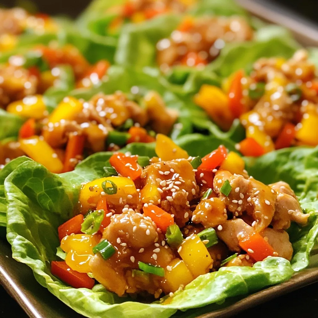 - 1 lb boneless, skinless chicken thighs, diced - 1 tablespoon vegetable oil - 3 cloves garlic, minced - 1 inch piece of ginger, grated - 1/4 cup teriyaki sauce (store-bought or homemade) - 1 tablespoon sesame oil - 1 cup bell peppers, finely chopped (mix of red and yellow for color) - 1 cup carrots, grated - 1/4 cup green onions, finely sliced - Salt and pepper to taste - 1 head of butter lettuce or romaine, leaves carefully separated - Sesame seeds for garnish To create these tasty teriyaki chicken lettuce wraps, gather fresh ingredients. The chicken thighs provide rich flavor and tender texture. You can swap them for chicken breast if you prefer a leaner option. For the sauce, you can use store-bought teriyaki sauce or make your own at home. If gluten is a concern, look for gluten-free teriyaki sauces. The vegetable oil helps cook the chicken well, while sesame oil adds depth to the flavor. You can add other veggies too! Try mushrooms or snap peas for added crunch. If you want a spicy kick, include some red chili flakes or sliced jalapeños. The lettuce serves as a fresh wrap, keeping the meal light. Butter lettuce offers a soft, delicate touch. Romaine is crunchier and sturdier, perfect for holding all the fillings. Feel free to mix and match ingredients based on your tastes and what you have on hand. {{ingredient_image_2}} 1. Start by heating the vegetable oil in a large skillet over medium heat. Make sure the oil is hot before you add anything. 2. Next, add the diced chicken thighs to the skillet. Cook for 5-7 minutes. Stir it often. The chicken should turn brown and be cooked through. 3. Once the chicken is ready, add in the minced garlic and grated ginger. Sauté these for 1-2 minutes. You want to smell their great aroma but don’t let the garlic burn. 4. Now, pour in the teriyaki sauce and sesame oil. Stir well to coat the chicken evenly. Let it simmer for 2-3 minutes to thicken the sauce a bit. 5. After that, toss in the finely chopped bell peppers and grated carrots. Cook this for another 3-4 minutes. You want them tender but still crisp. 6. Remove the skillet from heat. Stir in the sliced green onions. Season the mix with salt and pepper to taste. 7. To make the wraps, take a fresh lettuce leaf. Spoon a good amount of the chicken mix into the center. 8. Finally, sprinkle sesame seeds on each wrap. This adds a nice crunch. Enjoy these wraps while they are fresh and colorful! To cook chicken perfectly, choose boneless, skinless thighs. They stay juicy and tender. Cut them into small, even pieces for quick cooking. Heat the vegetable oil in your skillet until it shimmers before adding the chicken. Cook for 5-7 minutes, stirring often. This keeps the chicken from sticking and ensures even cooking. When adding garlic and ginger, be careful not to burn them. Sauté these for just 1-2 minutes. The smell will be amazing! After that, pour in teriyaki sauce and sesame oil. This mixture adds great flavor. Let it simmer for 2-3 minutes to thicken. For the veggies, cut bell peppers and carrots into small pieces. This helps them cook fast and stay crunchy. Add them after the chicken is cooked. Cook for 3-4 minutes. They should be tender but still crisp. To serve your wraps, place the chicken mix in a fresh lettuce leaf. Use butter lettuce or romaine for the best wraps. It’s fun to eat and looks nice! For garnish, sprinkle sesame seeds on top. They add crunch and a nice look. You can also serve these wraps with a side of rice or quinoa. It makes a filling meal. Enjoy your tasty and healthy wraps! Pro Tips Marinate for Flavor: For an extra burst of flavor, marinate the diced chicken in teriyaki sauce for at least 30 minutes before cooking. This enhances the taste and tenderness of the chicken. Use Fresh Ingredients: Fresh garlic and ginger will provide a more vibrant flavor than pre-minced or powdered versions. Always opt for fresh whenever possible for the best results. Customize Your Vegetables: Feel free to add other vegetables like mushrooms, snap peas, or zucchini to the mixture. This not only adds color but also increases the nutritional value of your wraps. Serve Immediately: These lettuce wraps are best enjoyed fresh. Assemble just before serving to maintain the crispness of the lettuce and the warmth of the chicken filling. {{image_4}} You can switch up the protein in these wraps. Tofu or shrimp are great choices. Tofu absorbs flavor well, while shrimp adds a nice seafood twist. You can also try different sauces. Instead of teriyaki, you can use soy sauce or even a spicy chili sauce for a kick. For vegetables, think outside the box. You could use zucchini, mushrooms, or even shredded cabbage. Each option adds a unique taste and texture. These wraps pair nicely with rice or quinoa. Serve them on the side for a complete meal. If you want to go low-carb, skip the rice. You can also create a keto version by adding more healthy fats. Top your wraps with avocado or a drizzle of olive oil for extra richness. Enjoy them fresh for the best flavor! To keep your teriyaki chicken fresh, store it in an airtight container. Make sure it cools first. You can refrigerate it for 3 to 4 days. Always check for any signs of spoilage before eating. To reheat the chicken mixture, use a skillet over medium heat. Stir it often to avoid burning. You can add a splash of water or teriyaki sauce if it seems dry. This keeps the chicken juicy and tasty. If you want to save some for later, freezing works well. Divide the chicken mixture into portions. Use freezer bags or containers that can seal tightly. Label each bag with the date. It’s best to eat frozen meals within 2 to 3 months for the best taste. When you’re ready to eat, thaw it in the fridge overnight. To heat, use a skillet again or a microwave. Just be careful not to overcook it. Enjoy your teriyaki chicken wraps even after some time! I love using butter lettuce or romaine lettuce for wraps. These types are soft and hold the filling well. They al
