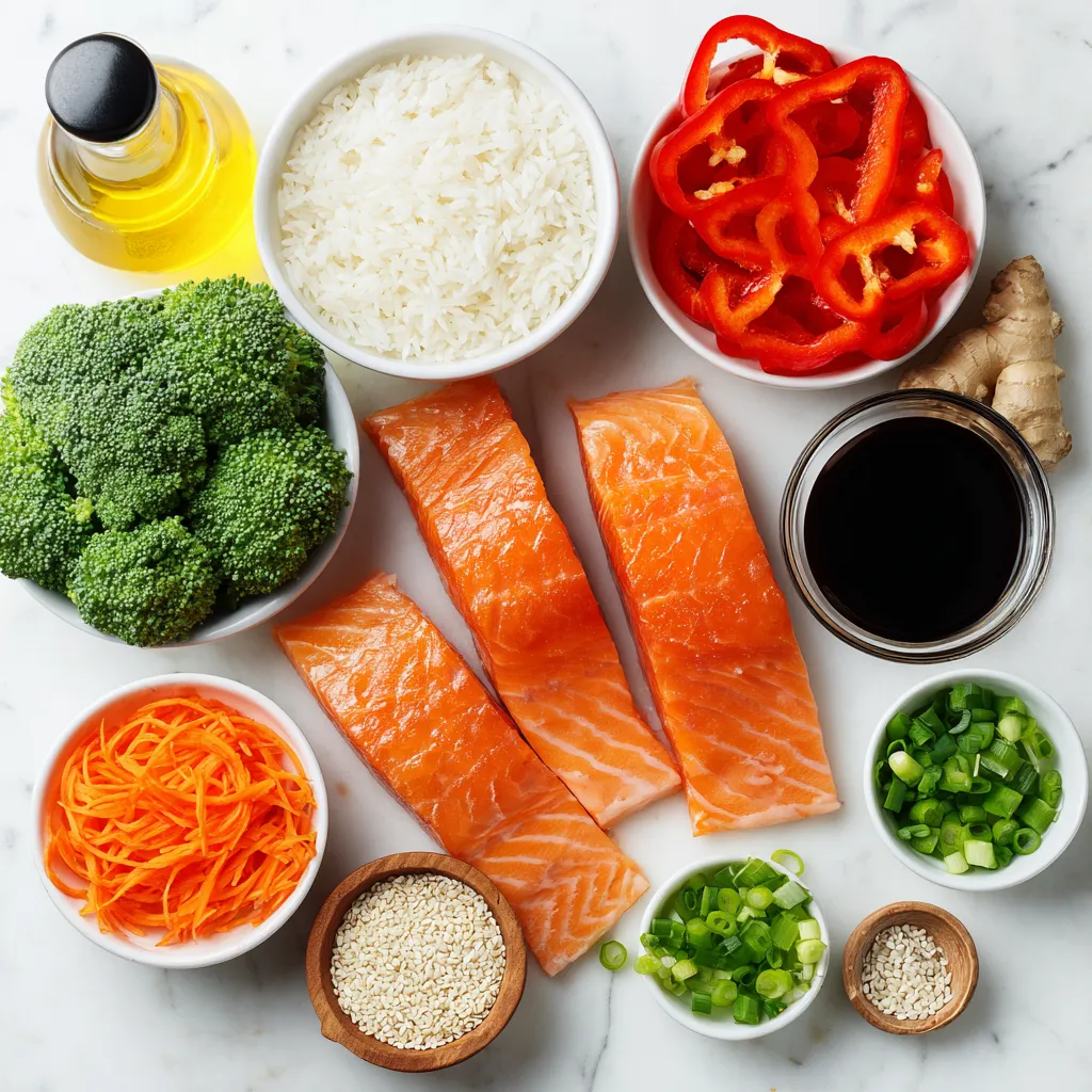 In this tasty dish, fresh salmon is the star. You want good-quality salmon fillets for the best flavor. I love using bright, crisp vegetables like broccoli, red bell pepper, and carrot. They add color and crunch. Cook jasmine rice to create the perfect base for your bowl.