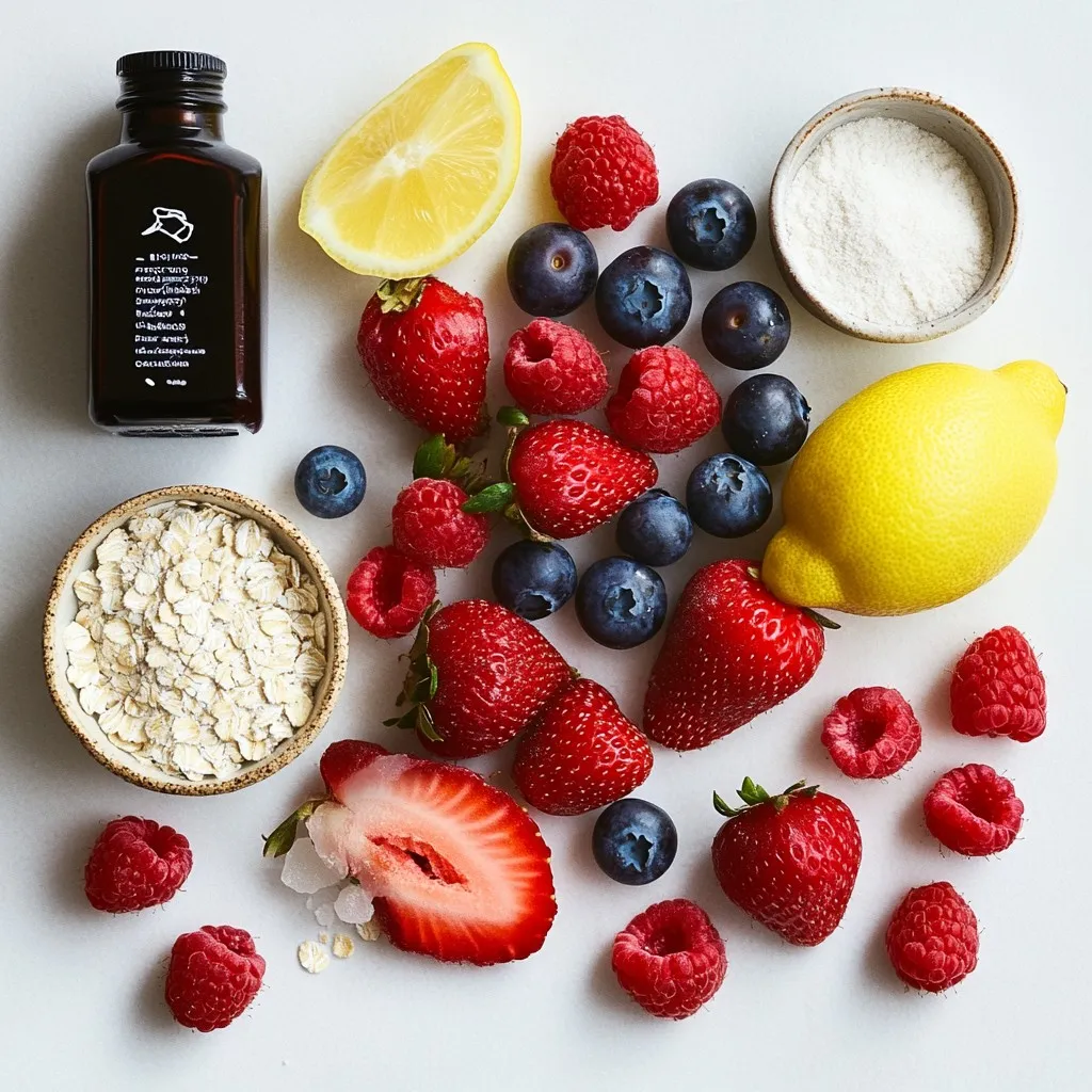Next, gather the topping ingredients. Granulated sugar adds sweetness. Fresh lemon juice brightens the flavors. Pure vanilla extract gives a warm note. Rolled oats provide a nice crunch.