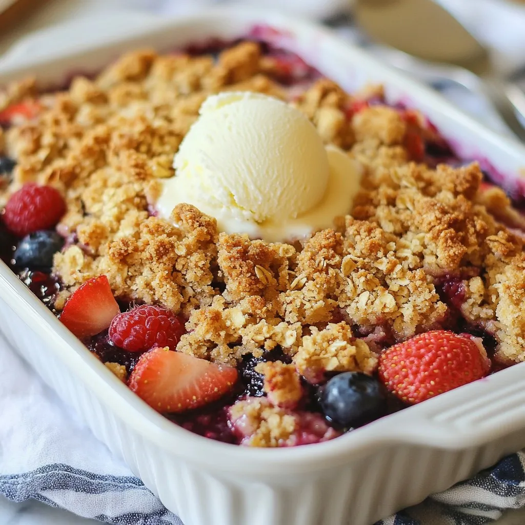 - 1 cup fresh strawberries, hulled and sliced - 1 cup plump blueberries - 1 cup juicy raspberries - 3 tablespoons granulated sugar - 1 tablespoon fresh lemon juice - 1 teaspoon pure vanilla extract - 1 cup rolled oats - 1/2 cup all-purpose flour - 1/2 cup packed brown sugar - 1/2 teaspoon ground cinnamon - 1/4 cup unsalted butter, melted - A pinch of salt To make a great Triple Berry Crisp, focus on the fresh berries. Strawberries, blueberries, and raspberries work well together. They bring a sweet and tangy flavor to your dish. Aim for ripe berries for the best taste. Next, gather the topping ingredients. Granulated sugar adds sweetness. Fresh lemon juice brightens the flavors. Pure vanilla extract gives a warm note. Rolled oats provide a nice crunch. All-purpose flour helps bind the topping. Brown sugar gives a rich taste. Ground cinnamon adds warmth and spice. Melted unsalted butter brings everything together. Lastly, a pinch of salt enhances all the flavors. Having all these ingredients ready makes your cooking process smooth and fun. This dish is simple yet full of flavor. Enjoy the joy of creating this delightful dessert! {{ingredient_image_2}} - Preheat your oven to 350°F (175°C). - Grease an 8x8 inch baking dish with butter or cooking spray. This helps the crisp come out easily. - In a large bowl, toss together 1 cup of sliced strawberries, 1 cup of blueberries, and 1 cup of raspberries. Make sure they mix well. - Add 3 tablespoons of granulated sugar, 1 tablespoon of fresh lemon juice, and 1 teaspoon of pure vanilla extract. Gently mix until the berries are coated. - Transfer the berry mix into your greased baking dish. Spread it evenly across the bottom. - In a separate bowl, combine 1 cup of rolled oats, 1/2 cup of all-purpose flour, 1/2 cup of packed brown sugar, 1/2 teaspoon of ground cinnamon, and a pinch of salt. Stir well to mix the dry ingredients. - Drizzle 1/4 cup of melted unsalted butter over the mixture. Use a fork or your fingers to mix until it looks crumbly. - Evenly distribute the oat topping over the berry layer in the baking dish. Make sure all the berries are covered. - Place the dish in your preheated oven. Bake for 25-30 minutes. The crisp is done when the top is golden brown and the berries bubble. Serve your Triple Berry Crisp warm right from the oven. This quick step makes a big difference. The berries will be bubbling and fragrant. For a special touch, add a scoop of creamy vanilla ice cream or a dollop of whipped cream on top. The cold creaminess pairs wonderfully with the warm crisp. Getting the right texture is key. You want a crumbly topping that is not too wet. To achieve this, mix the dry ingredients well before adding butter. The butter should coat the oats and flour evenly. This helps create that perfect crunch. For the berries, ensure they are fresh and not overly ripe. Avoid mushy berries by not over-mixing them. Gentle tossing is the way to go. Choose an 8x8 inch baking dish for a great fit. Glass or ceramic dishes work best for even baking. You can also use metal pans, but they may cook faster. Use a mixing bowl for the berry and dry mixtures. A fork works well for mixing the crisp topping. Make sure to have measuring cups and spoons handy for easy prep. Pro Tips Use Fresh Berries: For the best flavor and texture, opt for fresh, ripe berries. Frozen berries can work, but they may release more moisture and alter the crisp's texture. Customize the Toppings: Add some chopped nuts or shredded coconut to the oat topping for an extra crunch and flavor boost. Serve with Ice Cream: This dessert is best enjoyed warm with a scoop of vanilla ice cream or a dollop of whipped cream to balance the tartness of the berries. Store Properly: If you have leftovers, store them in an airtight container in the fridge for up to 3 days. Reheat in the oven for a few minutes before serving. {{image_4}} You can switch up the berries in your crisp for a fun twist. Try using blackberries or cranberries for a different taste. These berries add a tart flavor that contrasts nicely with the sweet topping. You can also mix in stone fruits like peaches or plums. Their juicy texture adds a nice depth to your dish. Just chop them up and add them to your berry mix. If you need gluten-free options, use gluten-free flour instead of all-purpose flour. This keeps the crisp tasty while fitting your diet. For a vegan version, swap the unsalted butter with coconut oil or a plant-based butter. You can also replace the granulated sugar with a vegan-friendly sweetener, like maple syrup. Want to kick up the flavor? Add spices like nutmeg or cardamom to the topping. These spices bring warmth and depth to the dessert. You might also consider adding nuts or seeds for a crunchy texture. Chopped almonds or walnuts sprinkle nicely on top and make your crisp even more delicious. To keep your Triple Berry Crisp fresh, store it in the fridge. Place it in an airtight container. This helps keep it from drying out. You can enjoy it for up to three days. If you want to save it longer, try freezing. Freezing Triple Berry Crisp is simple. Allow it to cool completely before covering it. Wrap it tightly in plastic wrap. Then, place it in a freezer-safe bag or container. This keeps the flavors intact. You can freeze it for up to three months. When you’re ready to eat, thaw it overnight in the fridge. To reheat, place it in the oven at 350°F (175°C) until warm. This will help restore the crisp topping and juicy berries. Enjoy every bite! Triple Berry Crisp is a warm dessert made with fresh berries. You use strawberries, blueberries, and raspberries for a mix of flavors. The berries get sweet and juicy as they bake. A crunchy topping made of oats, flour, and brown sugar sits on top. This crisp is both sweet and slightly tart, making it a delightful treat! Yes, you can use frozen berries! They are perfect if fresh ones are not available. Just make sure to thaw them first and drain excess juice. You may n