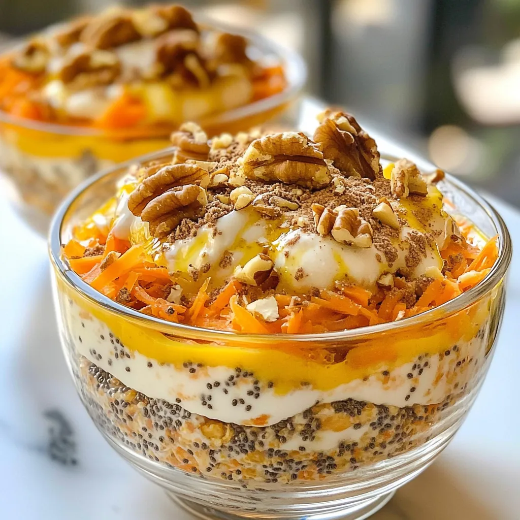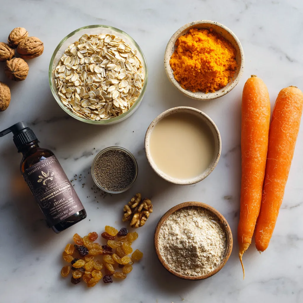 - 1 cup rolled oats - 1 ½ cups unsweetened almond milk - 1 medium carrot, finely grated - 2 tablespoons chia seeds - 2 tablespoons maple syrup - 1 teaspoon pure vanilla extract - ½ teaspoon ground cinnamon - ¼ teaspoon ground nutmeg - ¼ cup raisins or sultanas - ¼ cup chopped walnuts or pecans (optional) - A pinch of sea salt This recipe is vegan and dairy-free. It is also rich in fiber and healthy fats. Each serving is a good source of plant-based protein thanks to the oats and chia seeds. The nuts add crunch and protein, while the carrots provide vitamins and natural sweetness. This dish is perfect for a nutritious breakfast. You can swap the almond milk for any plant-based milk you like. Soy milk, coconut milk, or oat milk work well. If you want to skip the nuts, use seeds like pumpkin or sunflower seeds instead. You can also replace maple syrup with agave syrup or brown sugar. Enjoy experimenting to find your perfect mix! {{ingredient_image_2}} Start by gathering all your ingredients. You need rolled oats, almond milk, and a medium carrot. Grate the carrot finely. This helps it blend well. In a large mixing bowl, combine the rolled oats and almond milk. Stir until the oats soak in the milk. This step is key for a creamy texture. Next, add the grated carrot, chia seeds, maple syrup, and vanilla extract. Mix well so everything is combined. Now, sprinkle in the ground cinnamon, nutmeg, and a pinch of sea salt. Stir gently to spread the spices evenly. Fold in the raisins and half of your chopped nuts. This adds flavor and crunch. Save the rest of the nuts for later. Cover the bowl with a lid or plastic wrap. Place it in the fridge overnight. This lets the oats soften and flavors blend. In the morning, stir the oat mixture well. If you want it creamier, add a splash of almond milk. Serve the overnight oats in bowls or jars. Top with the remaining nuts for crunch. You can also sprinkle some cinnamon on top and drizzle with maple syrup. Enjoy your tasty breakfast! To make your vegan carrot cake overnight oats creamier, add more almond milk. A splash of milk in the morning can help, too. Mix it well to blend the flavors. You can also use thicker plant-based milks, like coconut milk. This change adds richness and a smooth texture. Sweetness is key in this recipe. I suggest starting with two tablespoons of maple syrup. Taste it after mixing, and add more if you like it sweeter. Honey is not vegan, but you can use agave nectar as an alternative. Remember, the raisins also add natural sweetness. For a pretty presentation, use clear jars or bowls. Layer the oats with nuts and a sprinkle of cinnamon on top. A drizzle of maple syrup makes it look inviting. You can also add a few extra raisins or a slice of carrot for a fun touch. Making it look good is part of the fun! Pro Tips Grate the Carrots Finely: Finely grating the carrots ensures they blend seamlessly into the oats, providing a smoother texture and better flavor integration. Adjust Sweetness to Taste: Feel free to modify the amount of maple syrup based on your preference for sweetness. Start with 2 tablespoons and add more if desired. Experiment with Spices: Don't hesitate to adjust or add spices like ginger or cloves to customize the flavor profile of your overnight oats. Serve with Fresh Toppings: For added freshness, consider topping your oats with sliced bananas, coconut flakes, or a dollop of dairy-free yogurt right before serving. {{image_4}} You can play with flavors to make these oats your own. Try adding a scoop of cocoa powder for a chocolate twist. You can also mix in some fresh pineapple for a tropical vibe. If you enjoy spice, add more nutmeg or a pinch of ginger. Want a sweeter touch? Toss in some chopped dates or dried apricots. Each option adds a fun twist to your vegan carrot cake overnight oats. The great news is that this recipe is already gluten-free. Rolled oats are naturally gluten-free, but always check the label. Some brands may process oats with gluten products. If you're keen on gluten-free, use certified gluten-free oats. You can rest easy knowing your breakfast is safe and delicious. To amp up the nutrition, consider adding a scoop of plant-based protein powder. It blends well and keeps you full longer. You can also mix in some ground flaxseed for extra fiber and omega-3s. If you want more vitamins, add some spinach or kale. These greens won't change the flavor much, but they boost the health benefits of your oats. Enjoy experimenting! Store your Vegan Carrot Cake Overnight Oats in the fridge. Use an airtight container to keep them fresh. Make sure to seal it tightly to avoid any odors. I recommend enjoying them within four days for the best taste. Freezing overnight oats is an option, but it changes the texture. If you choose to freeze, use a freezer-safe container. Leave some space at the top because the oats expand. They can last for up to three months in the freezer. When ready to eat, thaw in the fridge overnight. In the fridge, the oats last about four days. After that, they may lose their flavor or texture. If you freeze them, they’ll hold their quality for three months. Always check for any off smells or changes in texture before eating. Enjoy your healthy breakfast treat while it’s fresh! Yes, you can use any plant-based milk you like. Almond milk works great, but soy, oat, or coconut milk also taste wonderful. Each milk adds a unique flavor, so try different kinds to find what you enjoy most. To reduce sweetness, use less maple syrup. You can start with one tablespoon, then taste it. If it needs more sweetness, add just a bit more. You can also skip the maple syrup and use mashed banana instead. This will add natural sweetness without being too sugary. Chia seeds are tiny but powerful. They are full of fiber, which helps your tummy feel full. They also pack in omega-3 fatty acids, good for your heart. Plus, chia seeds absorb liquid and help make your oats creamy. Adding them boosts the nutritio